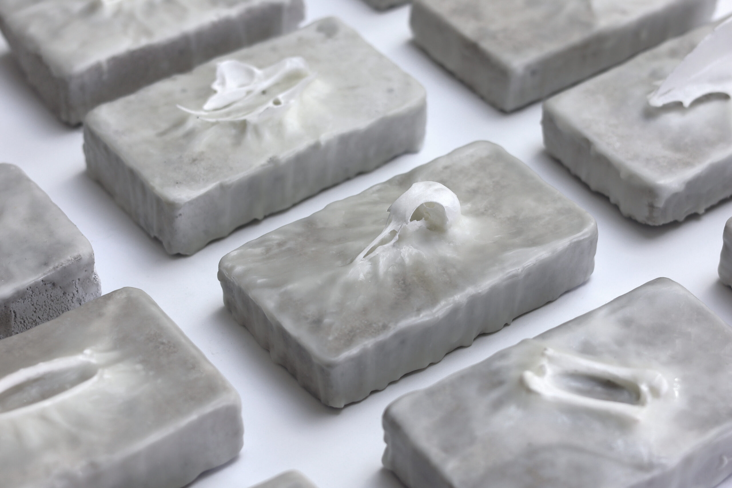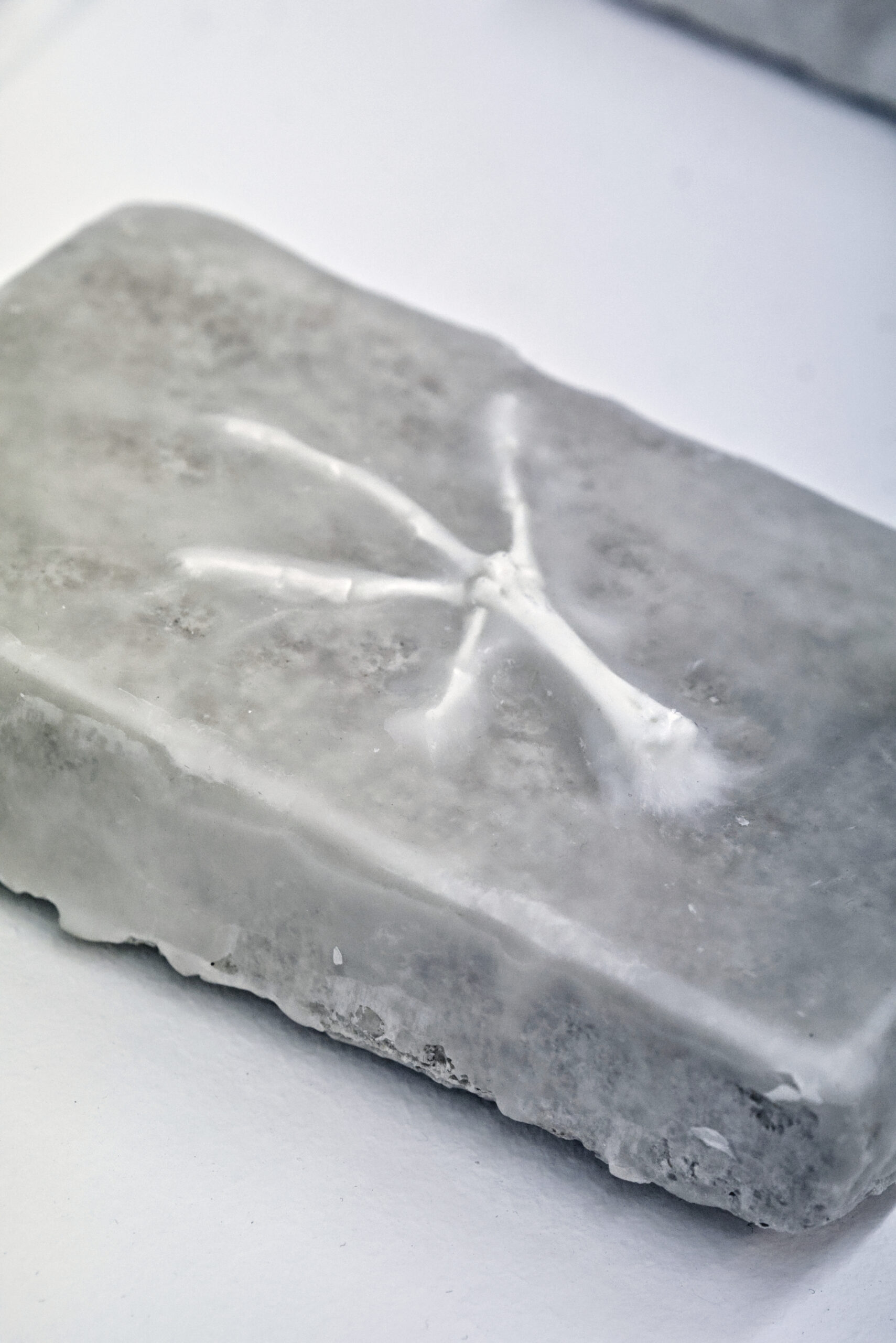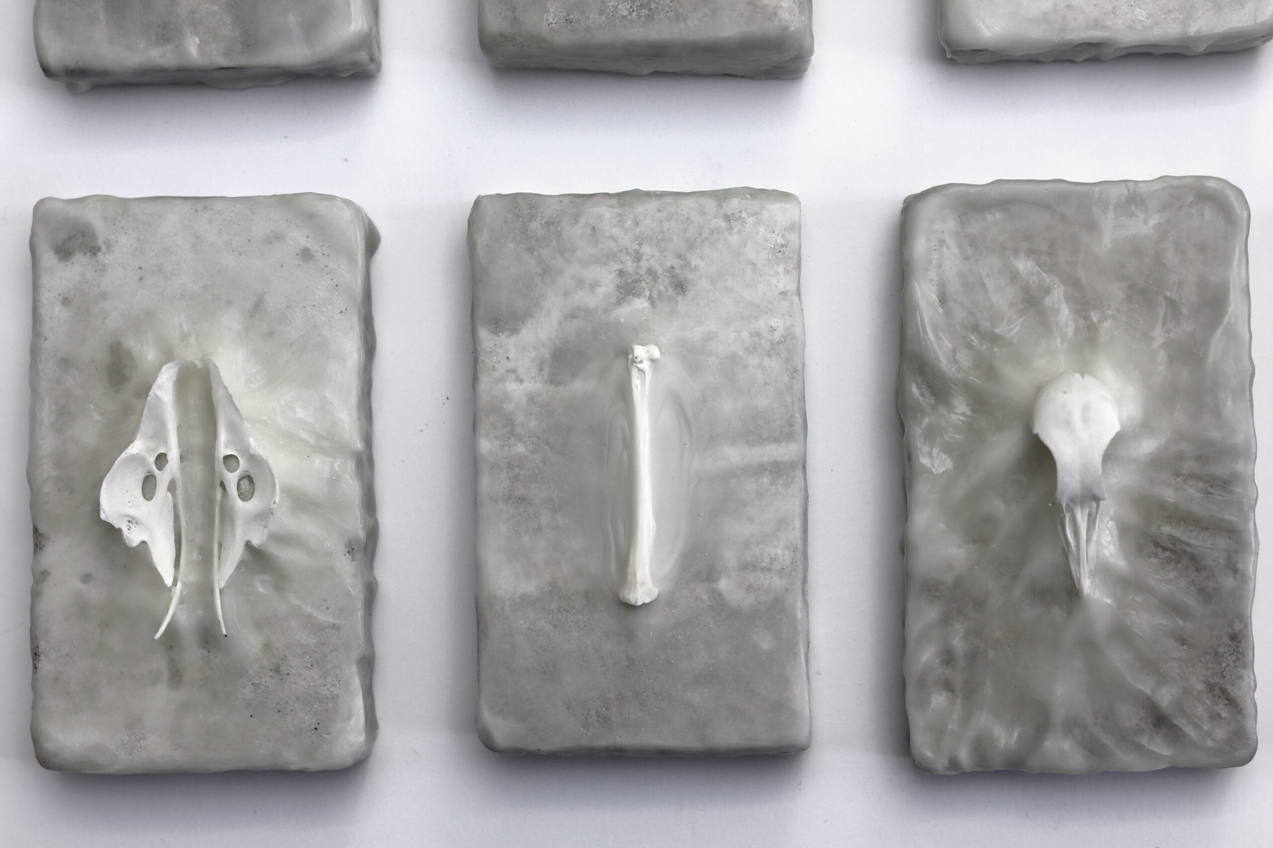 Inventaire de l’oubli, os de pigeon et cire d’abeille sur béton cellulaire, 16 sculptures de 13 x 7 x 4 cm, 2025