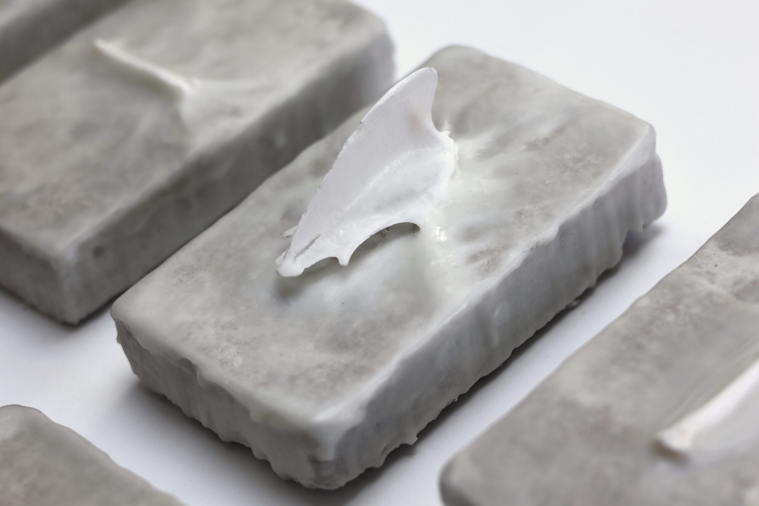 Inventaire de l’oubli, os de pigeon et cire d’abeille sur béton cellulaire, 16 sculptures de 13 x 7 x 4 cm, 2025