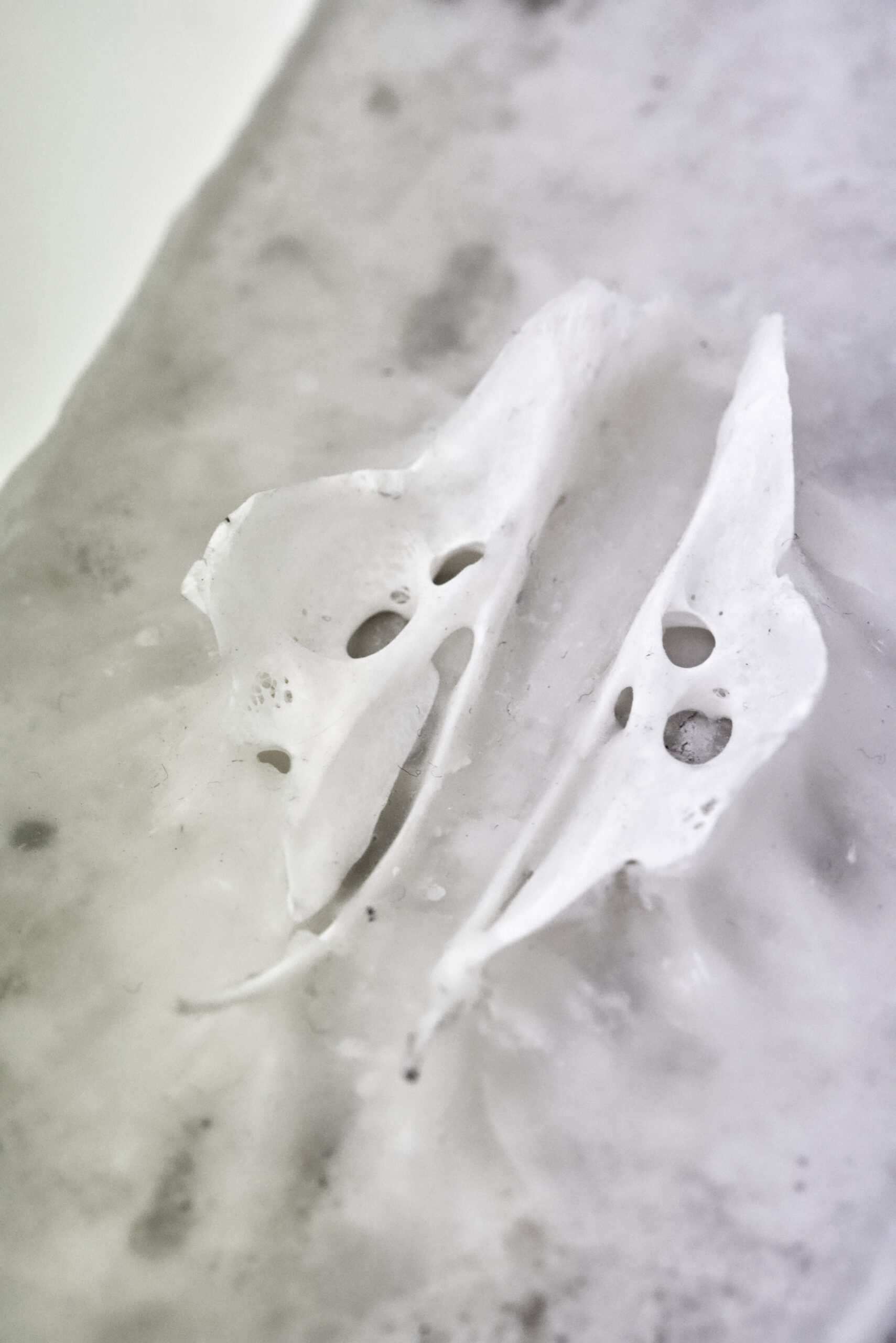 Cette série de sculptures dresse un inventaire des os qui composent le squelette d’un pigeon. J’ai récupéré cet animal, déjà mort, dans un refuge pour la faune sauvage où je suis bénévole. C’était un pigeon parisien, dans le corps duquel, lors de la dissection, j’ai découvert un mégot de cigarette.